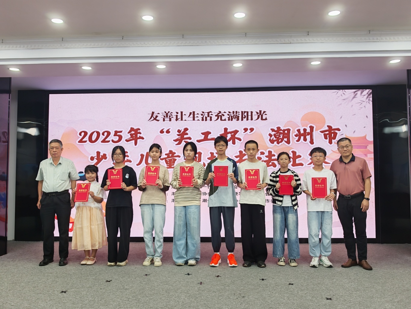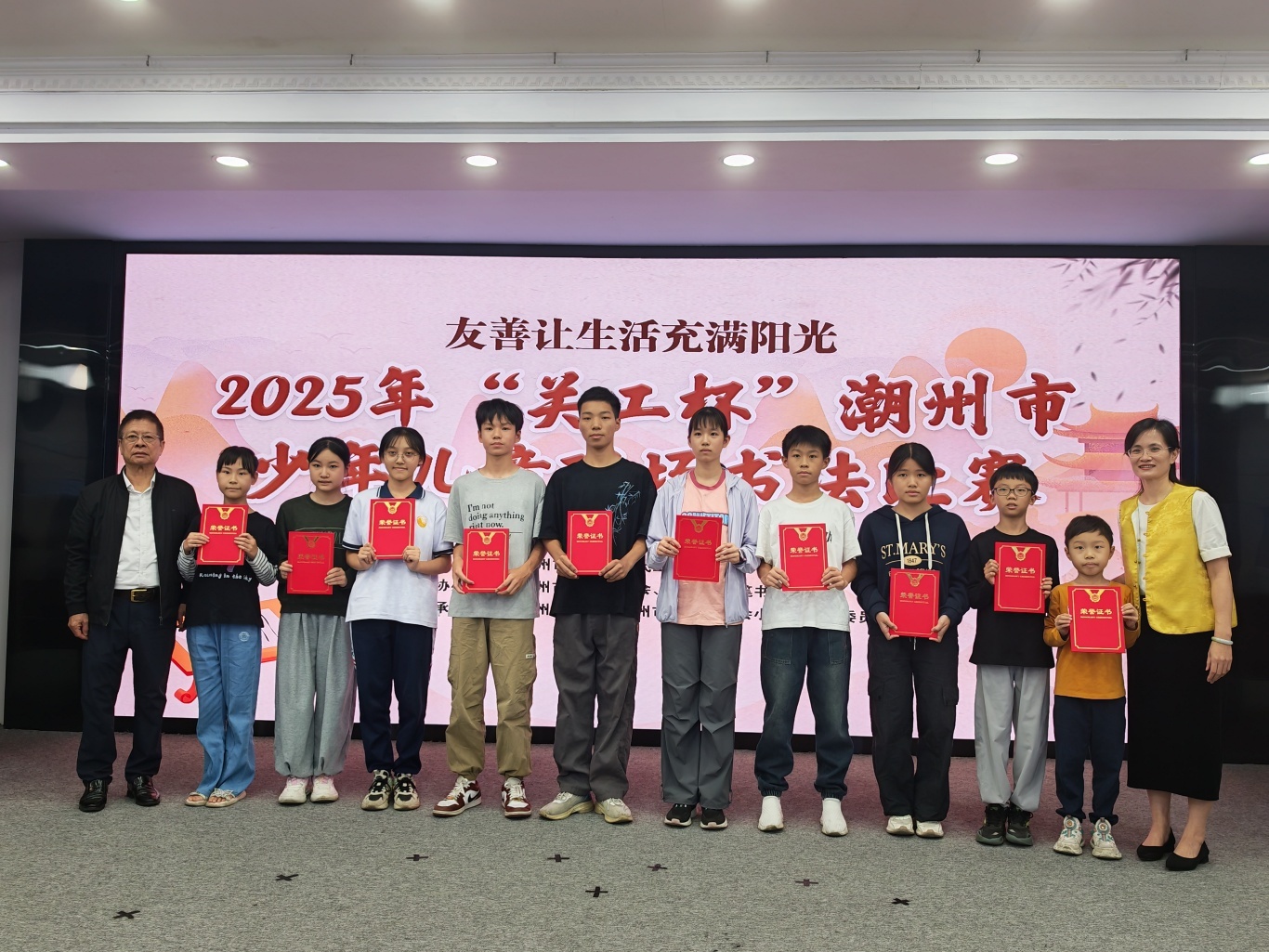頒獎儀式上,各組別獲獎名單正式公布。其中,兒童組一等獎由林詩蔓、丁銳騰、陳潤堉摘得,少年組一等獎歸屬程立熙、詹松濱、丁爍欣,所有獲獎者均獲得榮譽證書,一、二等獎獲得者還將獲得相應獎金,并可申請加入潮州市書法家協(xié)會小書家工作委員會。