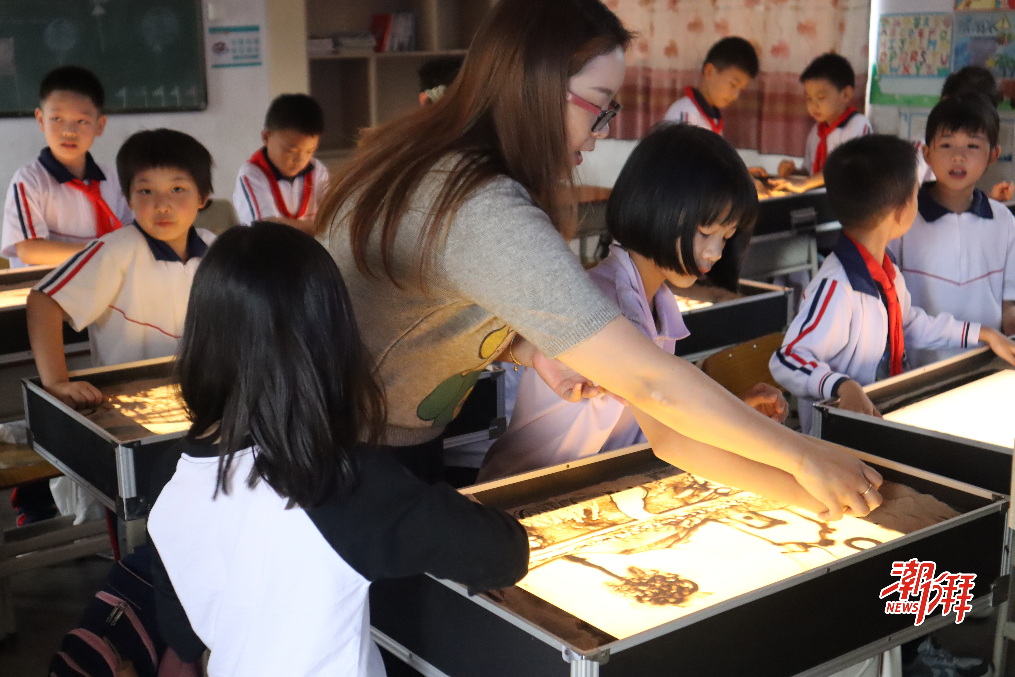 在獅峰小學,不同年級的學生根據安排走進專屬課堂,開啟各具特色的學習之旅。一、二年級的小朋友在美術老師耐心講解下,學習如何用畫筆給漆扇上色。三、四年級學生則走進沙畫藝術課堂,從握沙、撒沙學起,指尖流轉間,五彩細沙變成了一幅幅充滿童趣的作品。五年級學生專注體驗工夫茶藝,學習“高沖低斟”的沖泡手法;六年級學生則在英歌舞課堂上跟著老師學習基本的踏步、擺臂動作,感受非遺的活力。