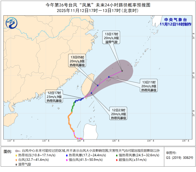 今年第26號臺風“鳳凰”(熱帶風暴級)已于12日19時50分前后在臺灣屏東縣恒春鎮沿海登陸,登陸時中心附近最大風力有9級(23米/秒),中心最低氣壓為990百帕。