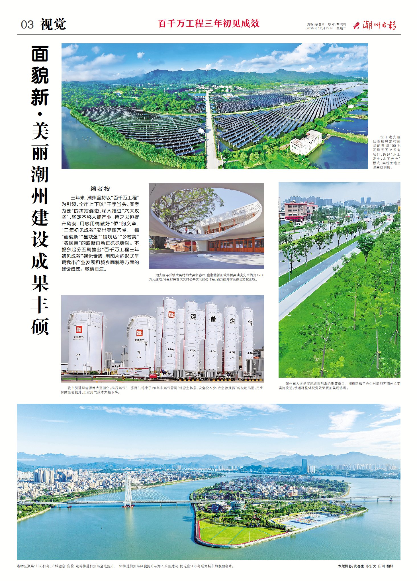 三年來,潮州堅持以“百千萬工程”為引領,全市上下以“干字當頭、實字為要”的拼搏姿態,深入推進“六大攻堅”,堅定不移大抓產業,持之以恒提升風貌,用心用情做好“僑”的文章,“三年初見成效”交出亮麗答卷,一幅“面貌新”“縣域強”“鎮域活”“鄉村美”“農民富”的嶄新畫卷正徐徐繪就。潮州日報今起分五期推出“百千萬工程三年初見成效”視覺專版,用圖片的形式呈現我市產業發展和城鄉面貌等方面的建設成效。敬請垂注。