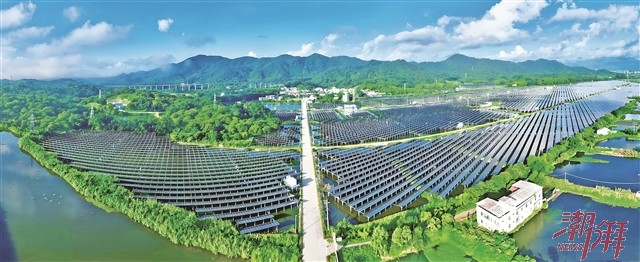 位于潮安區歸湖鎮鳳東村的華能歸湖100兆瓦漁光互補發電項目,通過“水上發電,水下養魚”模式,實現土地資源高效利用。
